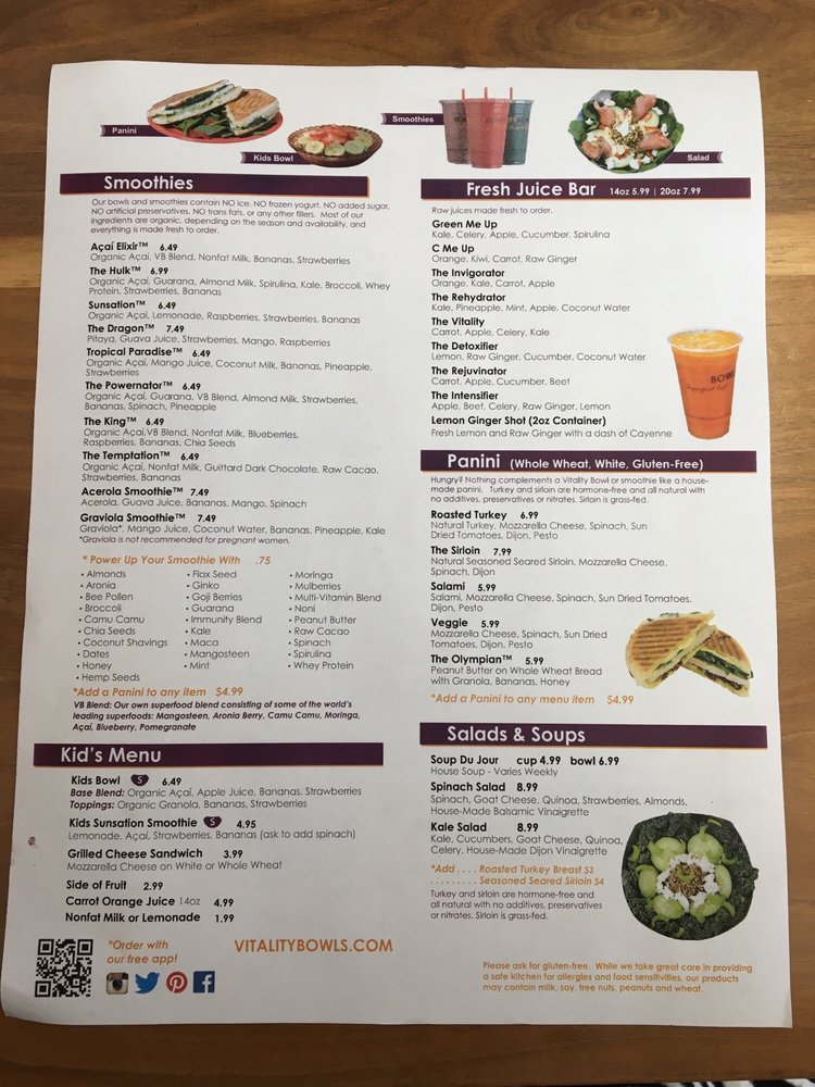 BASE: Organic Aa, Banana, Blueberries, Raspberries, Spinach, Multi-Vitamin Boost, Organic Flax Seed, VB Superfood Blend, Almond Milk; TOPPINGS: Organic Granola, Bananas, Strawberries, Organic Goji Berries, Almonds, Honey